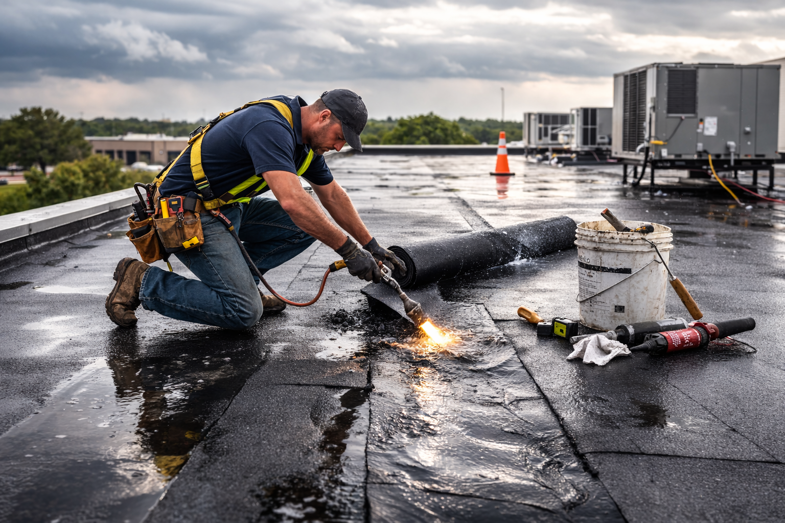Flat and low-slope membrane repair including TPO, EPDM, and modified bitumen